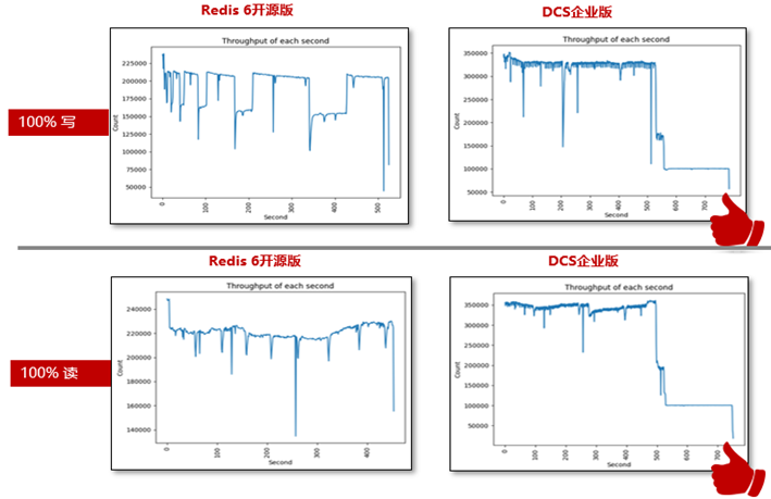 相比開源Redis 6.0,華為云分布式緩存服務(wù)企業(yè)版在QPS更高的前提下,性能抖動區(qū)間更小,100%讀寫情況下表現(xiàn)同樣出色,對客戶端影響極低。